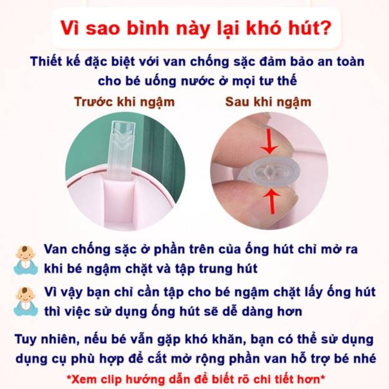 - Thiết kế hiện đại có van chống sặc, giúp nước không bị đổ ra ngoài kể cả khi bé nằm